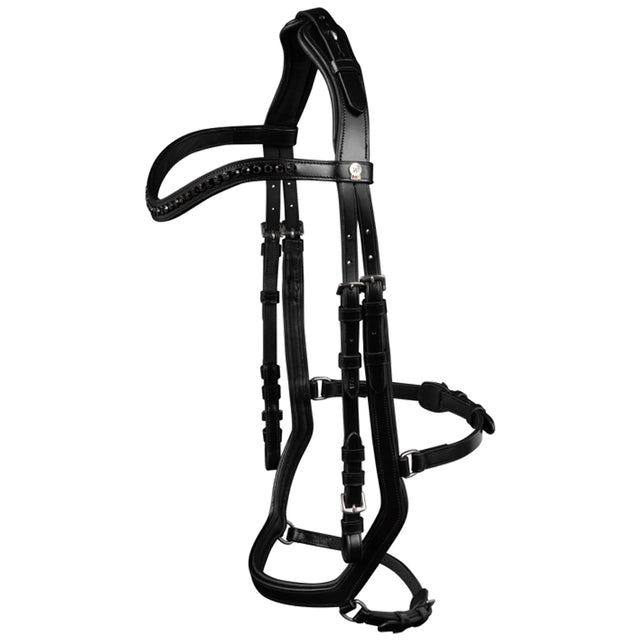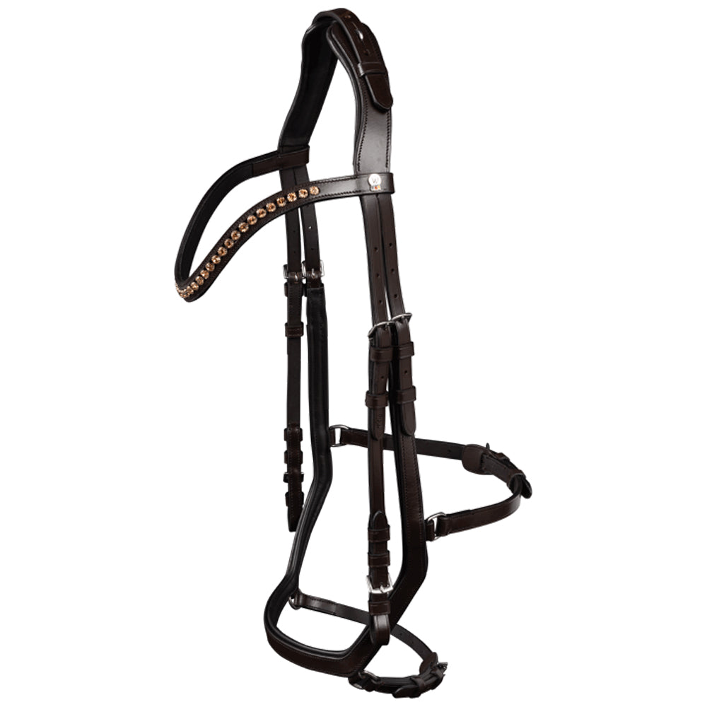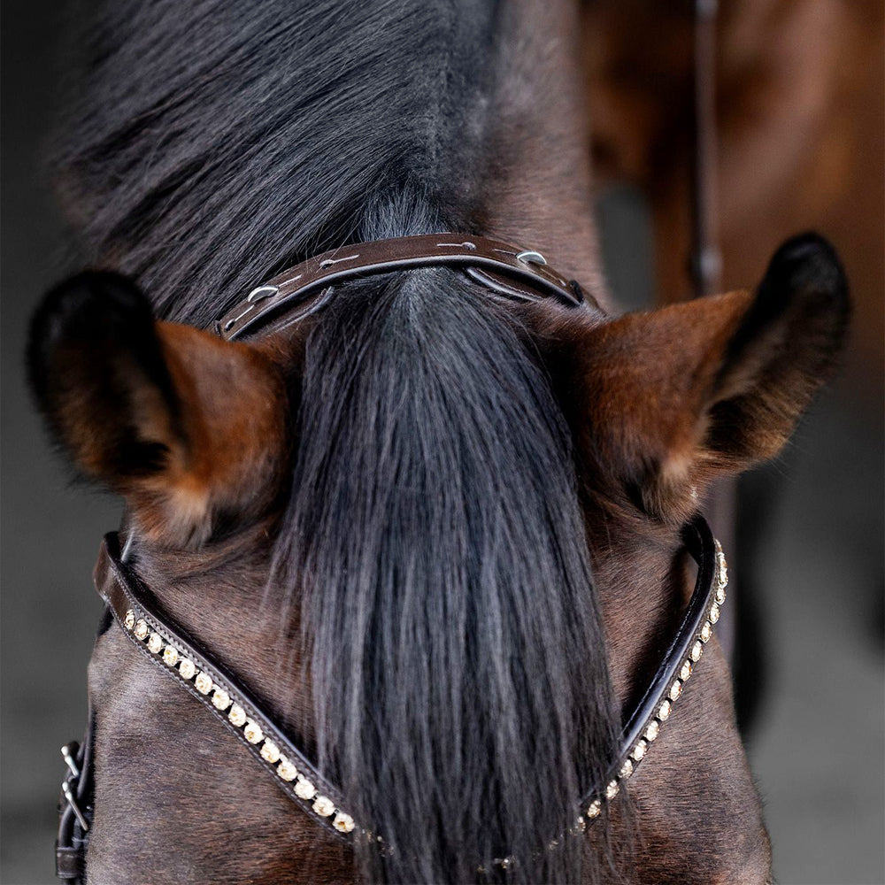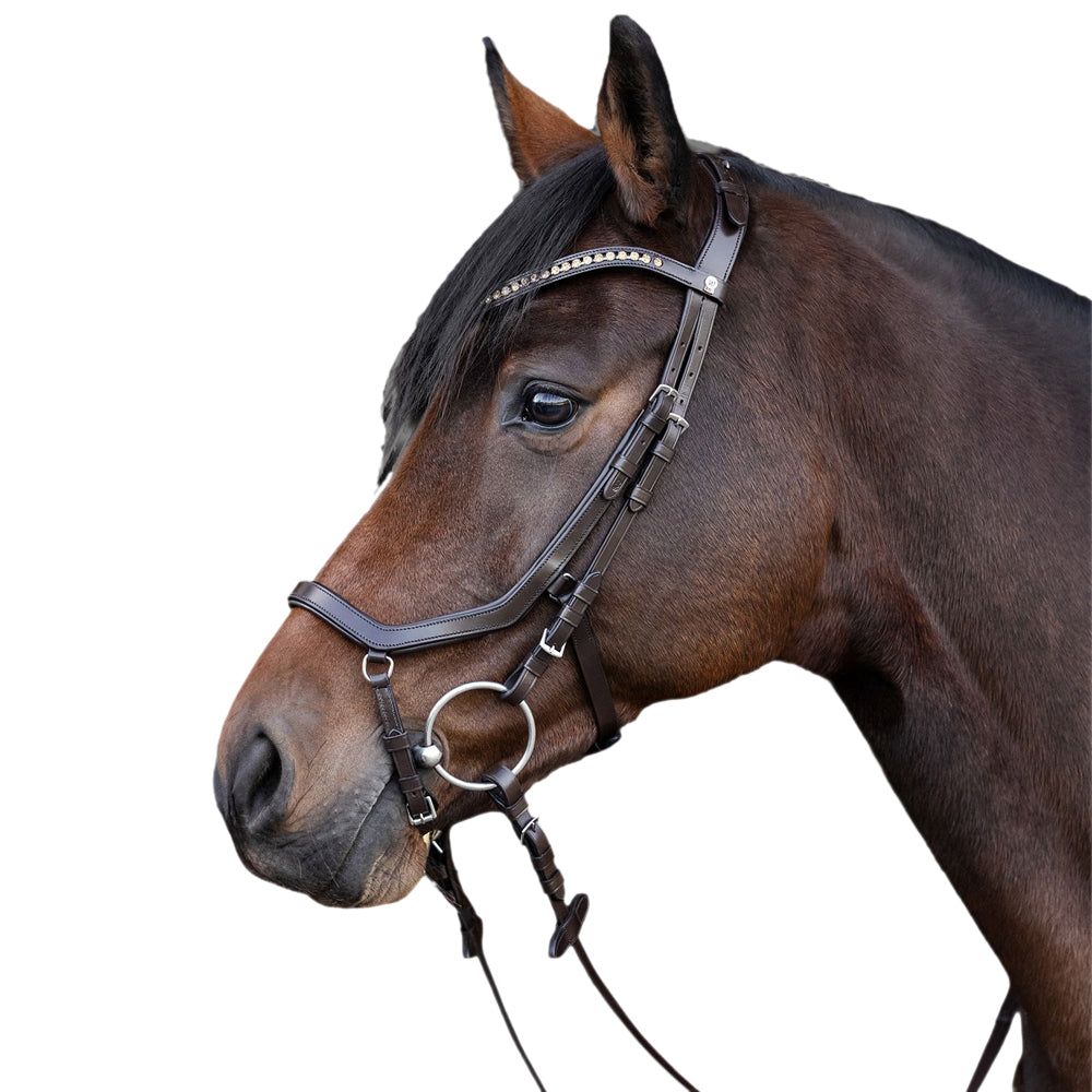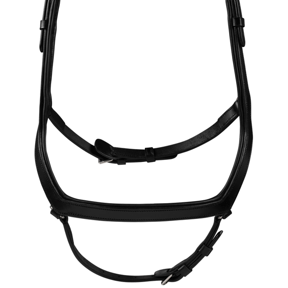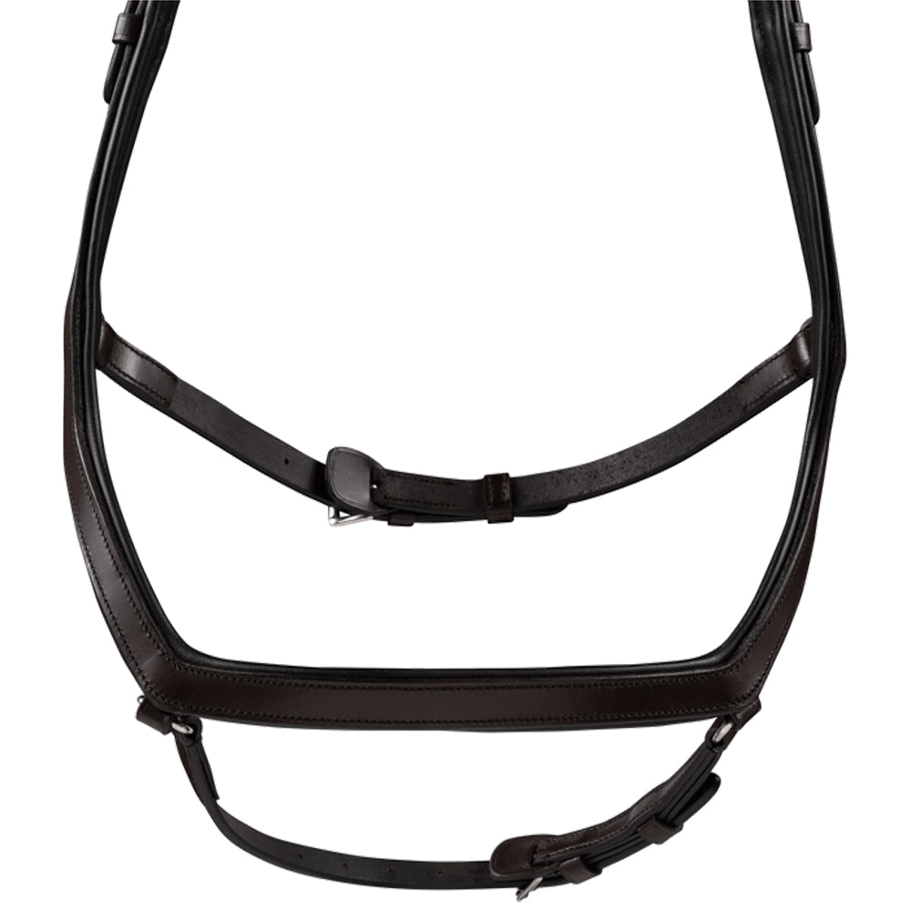 Un cinturino aggiuntivo per le ganasce assicura un sollievo ottimale ai lati della mascella inferiore, mentre il sopracapo presenta uno spazio extra per le orecchie e un’apertura centrale che evita pressioni sul legamento nucale. Nasiera e sopracapo sono inoltre dotati di morbida imbottitura per un comfort superiore. Completano la briglia le guarnizioni in acciaio inossidabile e le redini da 19mm.