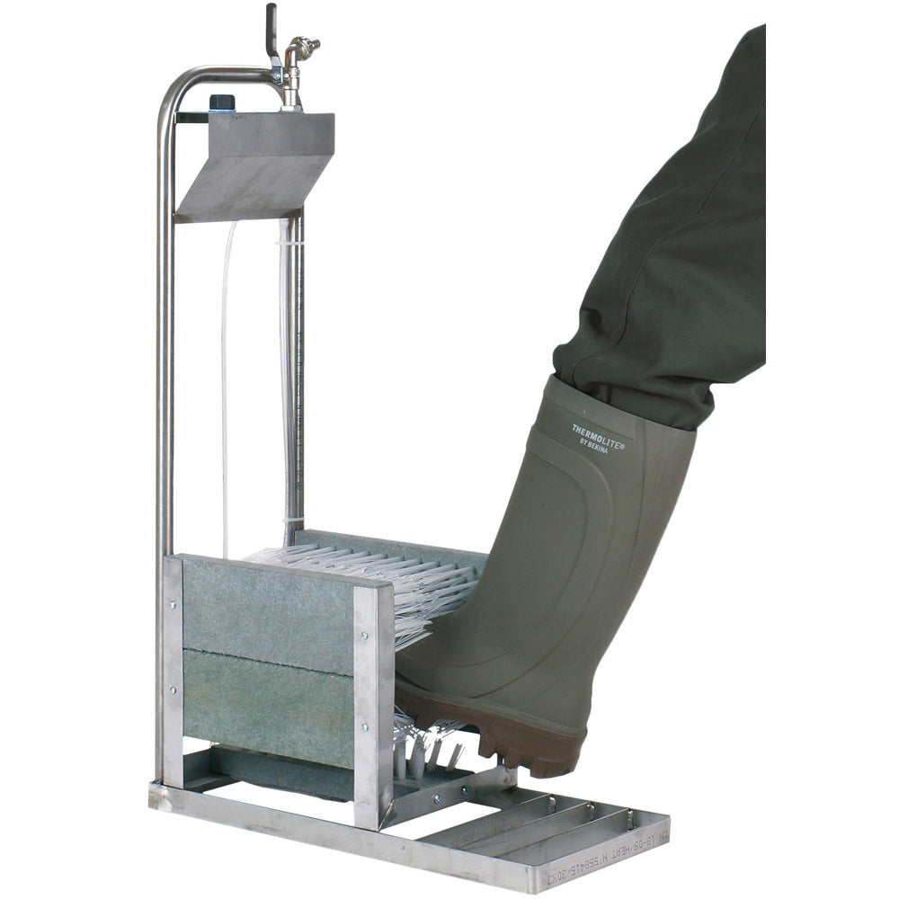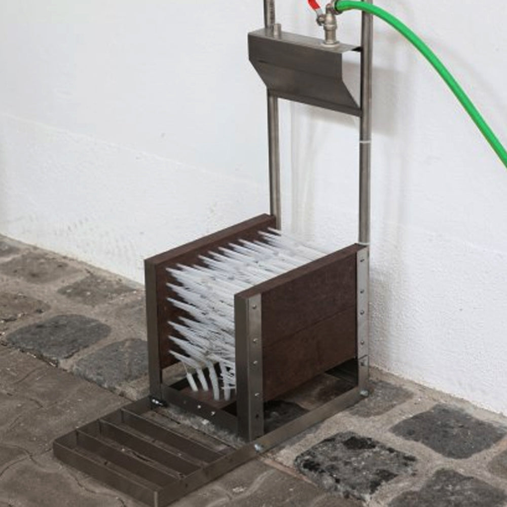 Pulitore per stivali professionale con attacco acqua da 1/2". Pulisce e igienizza rapidamente i vostri stivali da lavoro senza fatica. Dotato di grata e 5 spazzole robuste per una pulizia completa. Struttura in acciaio inox resistente, antiscivolo e antipedata grazie alla staffa di bloccaggio. Possibilità di collegamento a detergente o disinfettante. Facile da montare e ideale per ambienti di lavoro esigenti.