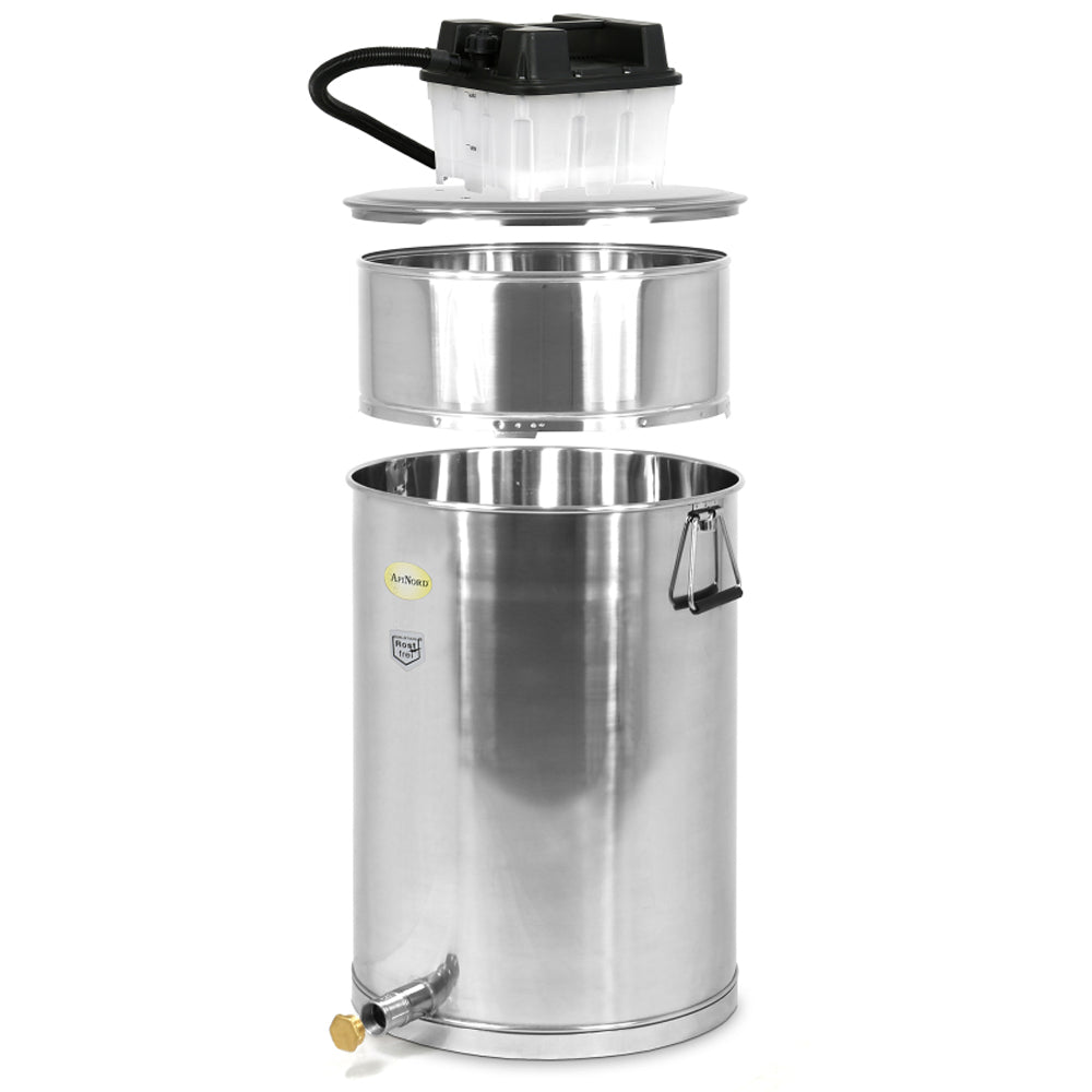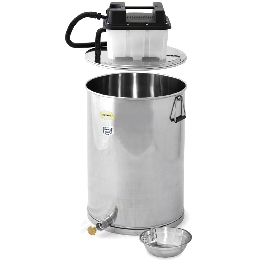 Il Dispositivo Elettrico ApiNord® Nirosta per Fusione ed Estrazione Cera rappresenta una soluzione professionale per la lavorazione efficiente della cera. Include un estrattore a vapore rotondo in acciaio inox con cestello a nido d’ape perforato e maniglie interne estensibili, per contenere fino a 12 telaini DN, ZA o Langstroth, o 10 telaini da nido Dadant. Dotato del Dampfmeister Pro da 7 litri (230 V / 2,3 kW), scarico da 1" con filettatura interna, tappo in ottone per l’uso opzionale come contenitore per lavaggio e una vasca in acciaio inox da 2,5 litri, garantisce una fusione sicura, pulita ed efficiente della cera. Altezza totale con il vapore master 86cm, diametro 43cm, per offrire affidabilità e praticità agli apicoltori professionisti.