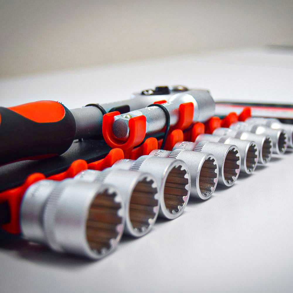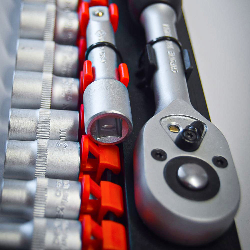 Affronta ogni lavoro di manutenzione con il Set di Bussole con Cricchetto 3/8" - 11 Pezzi, uno strumento indispensabile per professionisti e appassionati del fai-da-te. Il set include un cricchetto da 3/8" con 72 denti e manico ergonomico in bimateriale, una prolunga da 75mm e 9 bussole in acciaio cromo vanadio (8, 9, 10, 11, 13, 14, 16, 17, 19mm) per la massima resistenza e precisione. Tutti i componenti sono protetti da un sistema antifurto per un trasporto sicuro e affidabile.