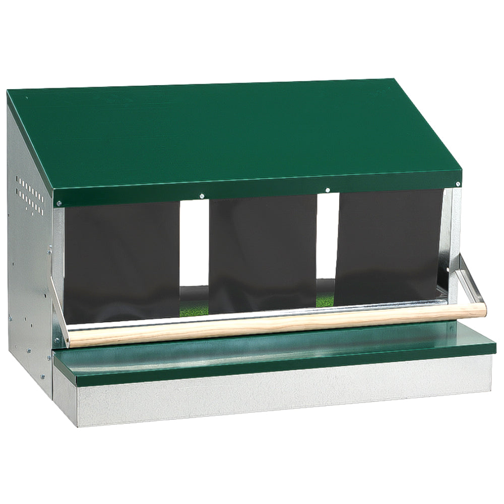 Con un design spazioso (798 x 515 x 510 mm), il nido fornisce ampio spazio per più galline, mantenendo ordine e pulizia. Il tetto inclinato impedisce agli animali di posarsi sopra, mantenendo l’area pulita.