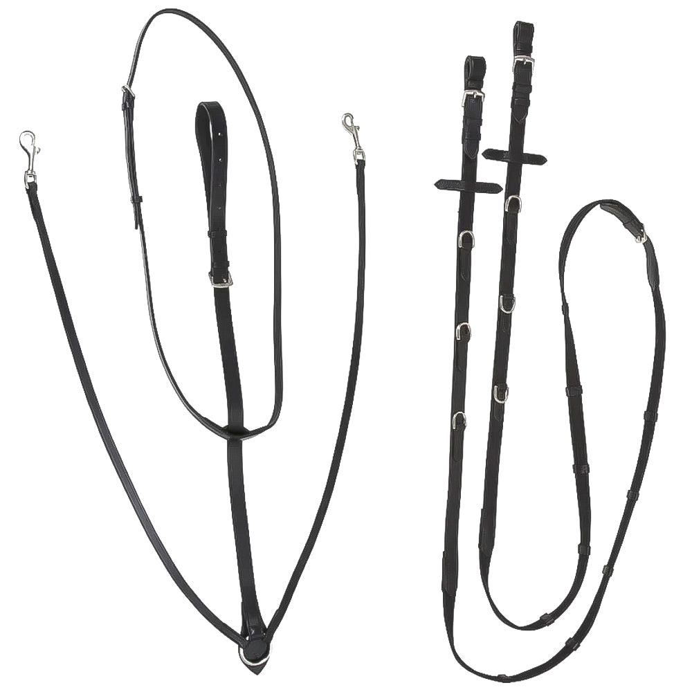 Le Redini Thiedemann con Martingala in Pelle e Ganci a Moschettone rappresentano una combinazione classica di redini con martingala, ideali per il controllo e la sicurezza del cavallo. Conosciute anche come redini Köhler, queste redini presentano una martingala con ganci a moschettone, perfetti per l'aggancio agli anelli D. La cinghia con staffe in pelle e 3 anelli D garantisce robustezza e funzionalità. Queste redini non sono omologate per tornei secondo la LPO (Leistungs-Prüfungs-Ordnung, regolamento ufficiale tedesco per i concorsi di equitazione). Realizzate in pelle nera, sono adatte per l'uso su poni e cavalli.
