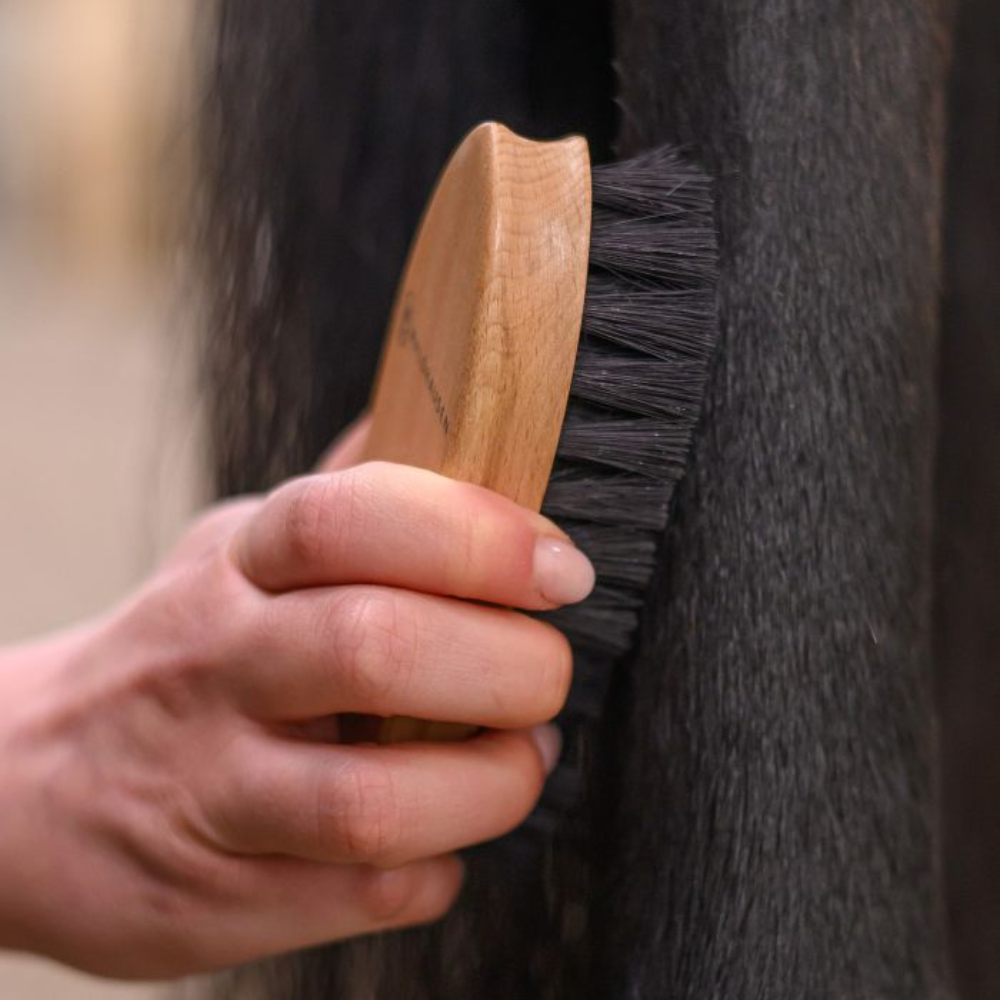 La brusca Exclusive Line con setole rigide rimuove con affidabilità anche lo sporco più intenso dal corpo e dagli arti del cavallo. Ottima per macchie ostinate di erba o fango.