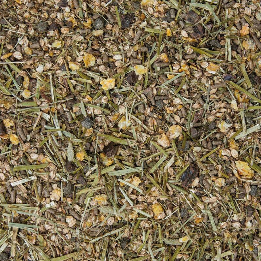 Orzo, corn flakes, erba medica, bucce di girasole, panello di girasole, polpa di mela, carruba, crusca di frumento, fieno di fleolo, lievito di birra, cicoria, carbonato di calcio, semi di lino, cloruro di sodio, fosfato monocalcico, amido di patate, olio di girasole.