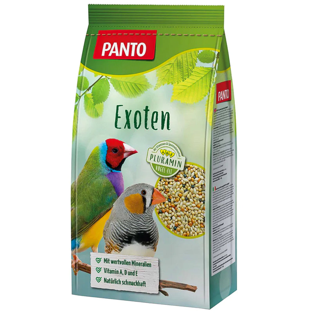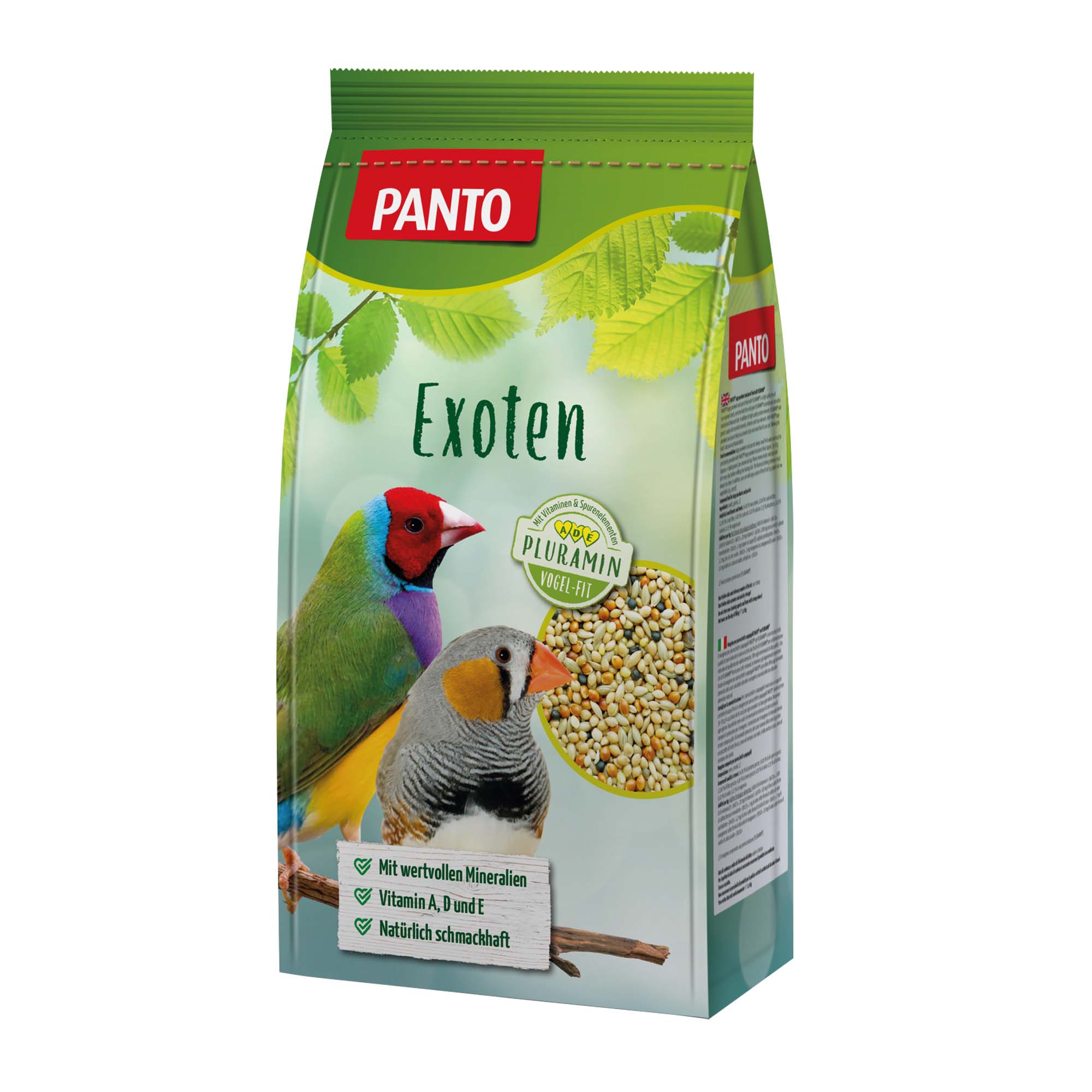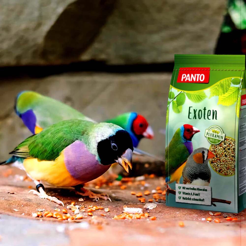- PANTO® cibo esotico con Pluramin® è una miscela di semi colorati che è specificamente adattata alle esigenze dei mangiatori di cereali tra loro, come: B. i magnifici fringuelli con le loro diverse sottospecie.