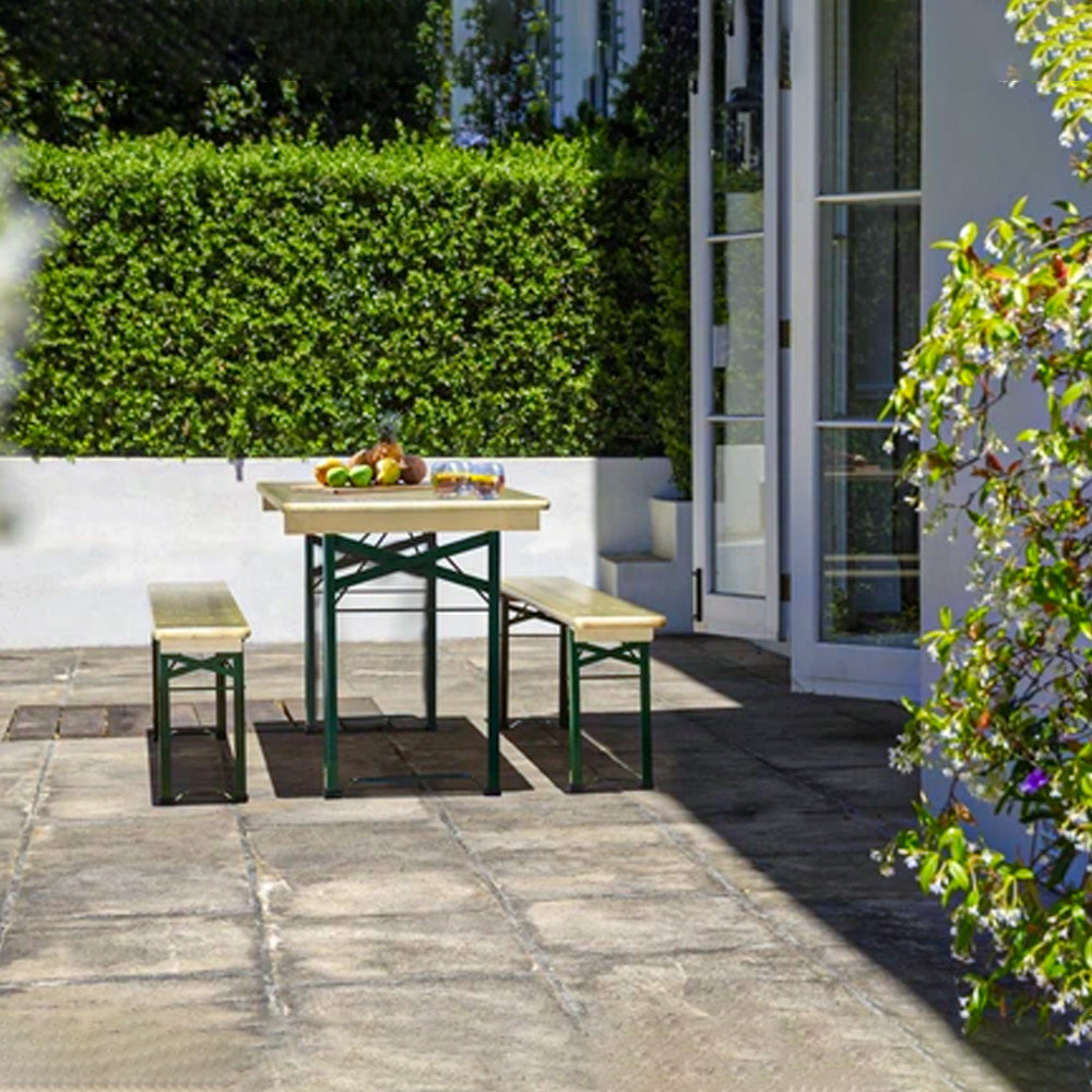 Robusto set birreria pieghevole in legno di abete con panche – ideale per feste, giardini e sagre. Vernice protettiva UV e struttura in acciaio resistente.
