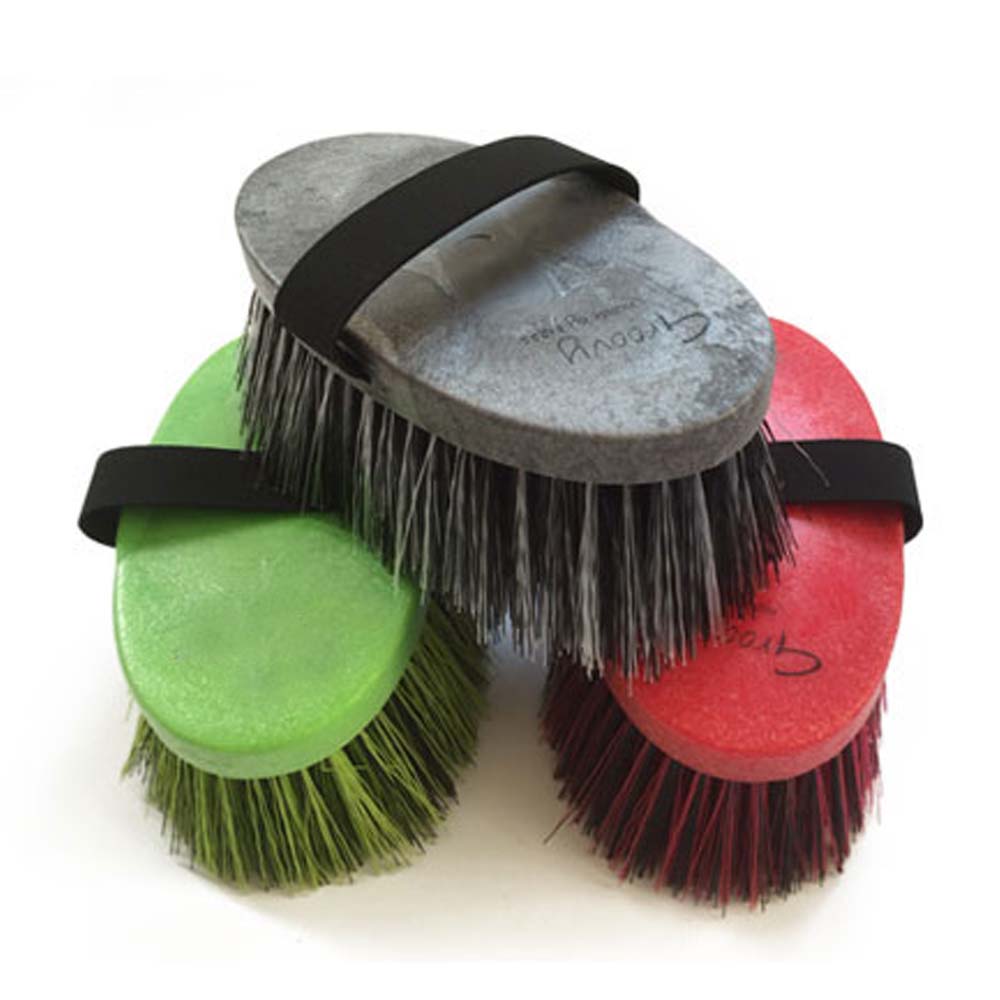 Pferdekardätsche Groovy mit weichen Polyamidborsten und Elastikriemen
