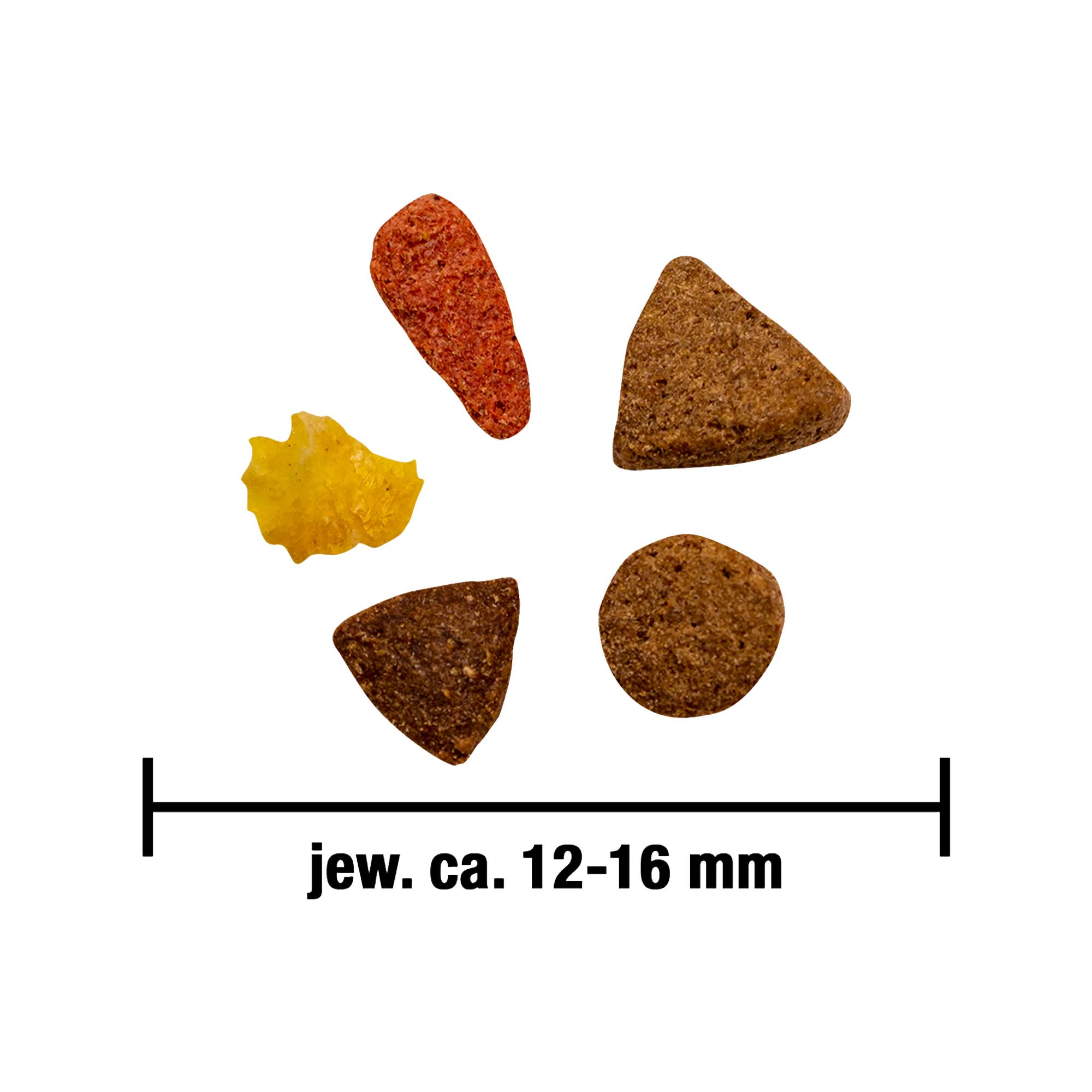- Weizenmehl, Geflügelmehl 20,00 %, Gerste, Mais 11,00 %, Weizengrießkleie, Weizen, Reis 3,00 %, Geflügelfett 2,90 %, Erbsen 2,50 %, Proteinhydrolysat, Calciumcarbonat, Karotten 0,70 %, Natriumchlorid, Maisgluten.