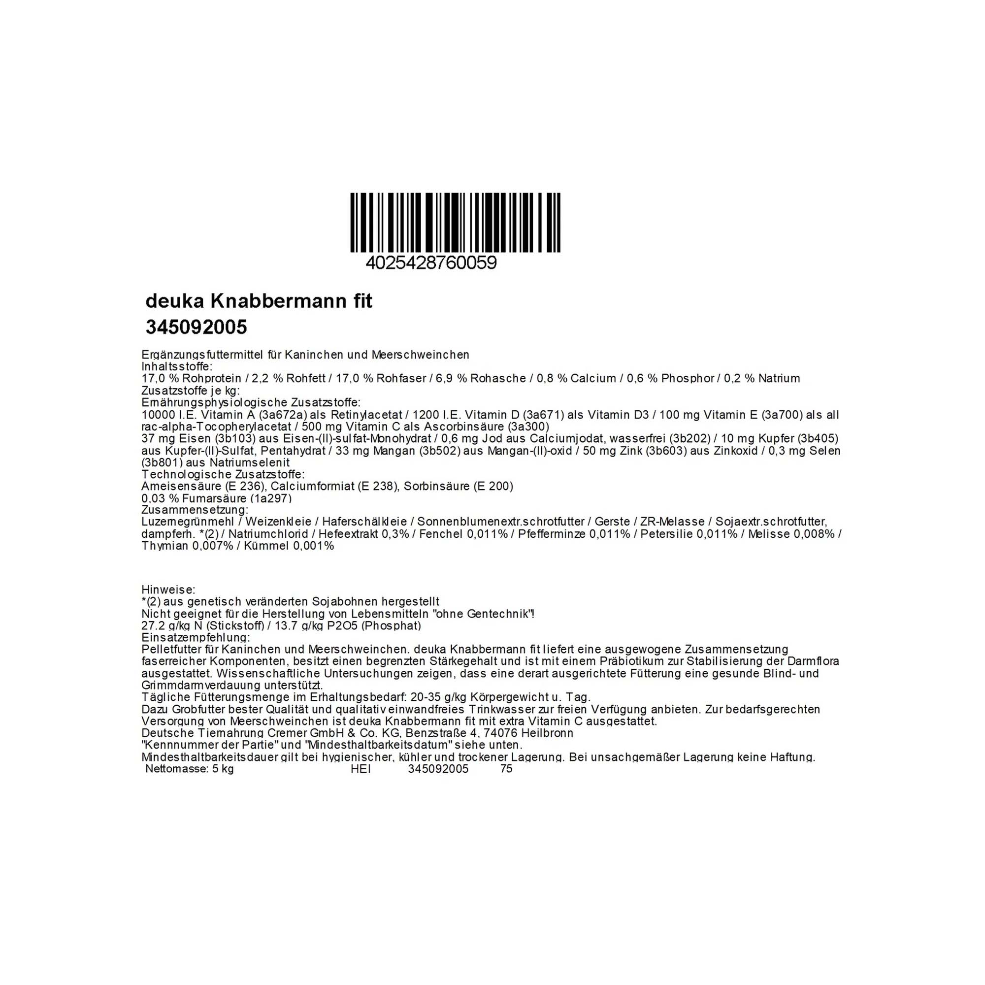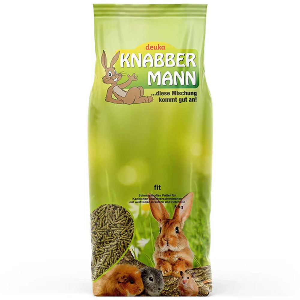 Knabbermann fit ist ein besonders bekömmliches Futter für Kaninchen, Zwergkaninchen und Meerschweinchen. Das Pelletfutter enthält ausgewählte Kräuter wie Petersilie, Fenchel, Pfefferminze, Zitronenmelisse, Thymian und Kreuzkümmel. Diese Kräuter machen das Futter besonders schmackhaft und tragen wertvoll zu einer artgerechten Ernährung von Kaninchen und Nagetieren bei. Durch die Extraportion Vitamin C eignet sich Knabbermann fit auch zur Ernährung von Meerschweinchen, die kein eigenes Vitamin C produzieren können. Für ein gesundes und vitales Leben müssen Kaninchen regelmäßig Calcium mit dem Futter aufnehmen. Wenn Sie zu viel davon einnehmen, scheidet Ihr Körper die überschüssigen Mengen über die Nieren aus, wodurch das Risiko der Bildung schmerzhafter Harnsteine (Calculi) steigt. Die Fütterung mit Knabbermann fit trägt durch Calciumformiat, einer hochverdaulichen Form dieses lebenswichtigen Nährstoffs, zur Vorbeugung der Bildung von Harnsteinen bei. Knabbermann fit unterstützt die natürliche Verdauung von Kaninchen und Nagetieren. Alfalfa ist eine wertvolle Ballaststoffquelle, die zu einer artgerechten Darmfunktion beiträgt. Präbiotische Zusätze stärken zusätzlich die Darmflora. Das besonders verträgliche Kräuterfutter ist frei von künstlichen Farbstoffen.