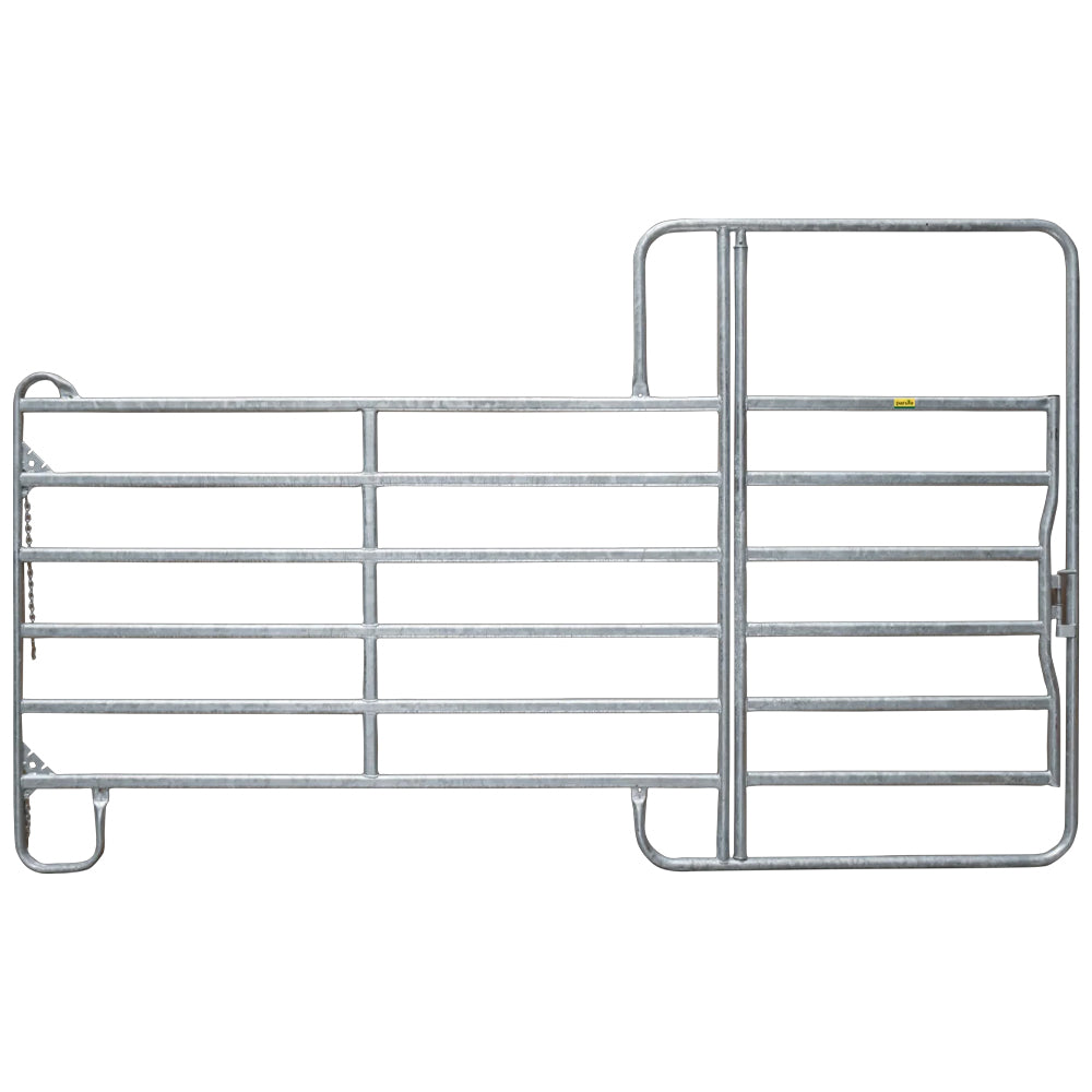 Das Panel Compact mit Tor und Mittelstrebe ist in den Längen 2,20m, 2,40m, 3,00m sowie 3,60 m mit einer Mittelstrebe erhältlich. Die feste Höhe beträgt 2,20m, das Tor bietet eine Durchgangshöhe von 2,10 m und eine Durchgangsbreite von 1,10m für schnellen und sicheren Zugang zu abgegrenzten Bereichen.