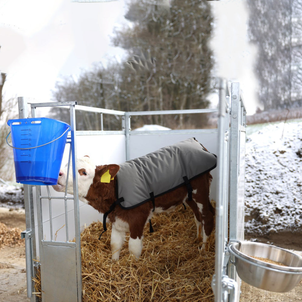 Das robuste Gestell aus feuerverzinktem Metall sorgt für Langlebigkeit, während die glatten PVC-Seitenwände besonders pflegeleicht sind. Eine seitliche Öffnung ermöglicht sozialen Kontakt mit anderen Kälbern und unterstützt ein gesundes Aufwachsen. Die zweiteilige Tür, die sowohl nach innen als auch nach außen öffnet, ist ideal für die Verwendung mit Tränkeeimern und erlaubt es dem Landwirt, den Boxbereich zu betreten oder zu verlassen, ohne das Kalb beim Trinken zu stören.