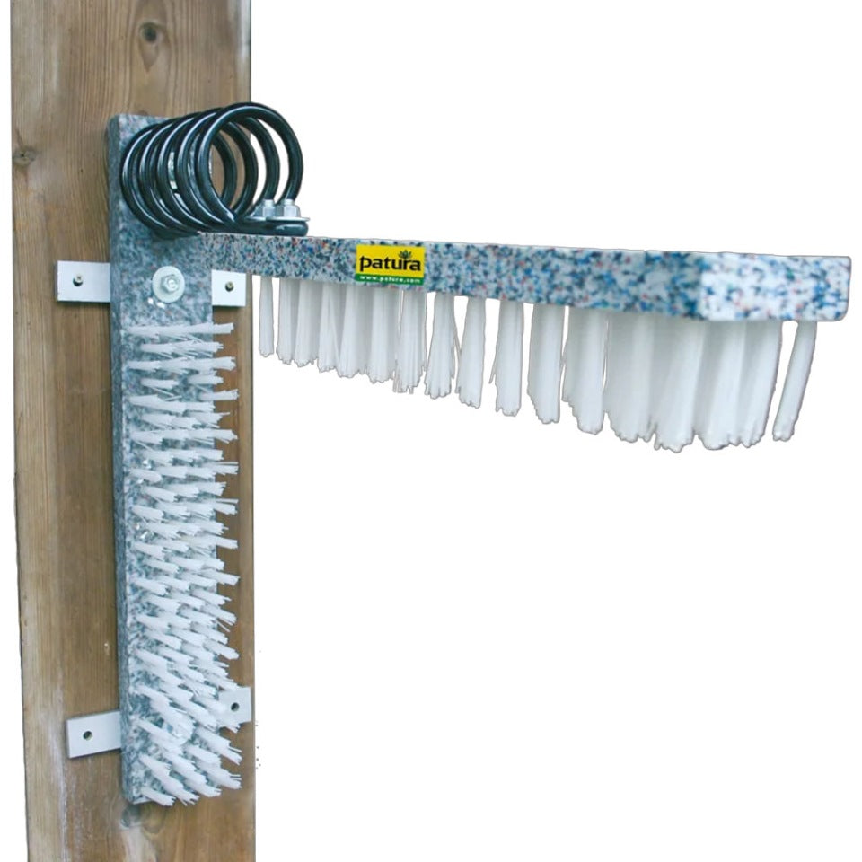 Die Kuhbürste mit Feder und Doppelbürsten sorgt für Sauberkeit und Wohlbefinden bei Nutztieren. Ausgestattet mit einer stabilen Feder und zwei Bürsten (60 und 70cm) bietet sie gründliche Reinigung und eine angenehme Massage. Geeignet für Kühe, Pferde und Schafe, unterstützt sie die Fellpflege und die Durchblutung. Nicht geeignet für Bullen.