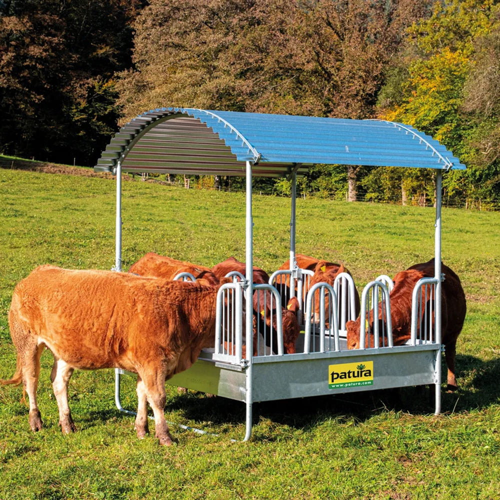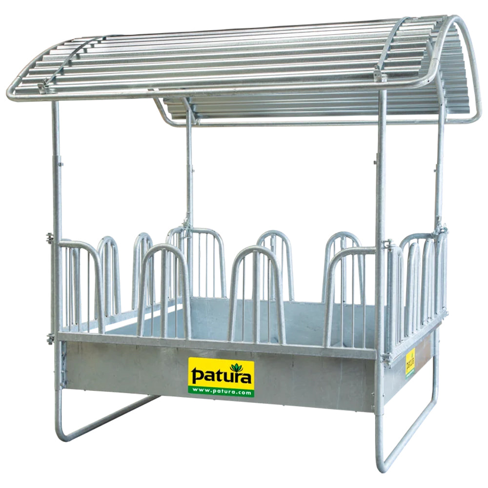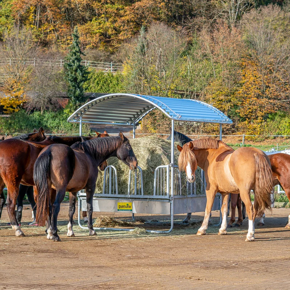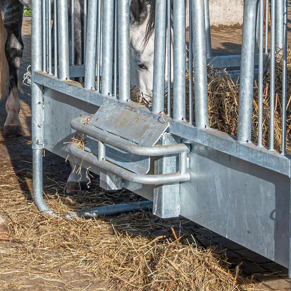 Zu den praktischen Eigenschaften zählen 2 leicht zu öffnende Seitenwände, höhenverstellbare Füße und Dach sowie die Vorbereitung für Dreipunktaufhängung. Mit einer Fütterungshöhe von 60/70 cm und Innenmaßen von 2,00 x 2,00m ist die Konstruktion sowohl für Pferdekomfort als auch für einfache Handhabung optimiert. Lieferung erfolgt als Bausatz mit vollständiger Montageanleitung.