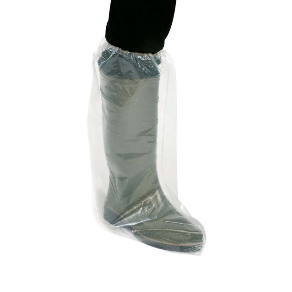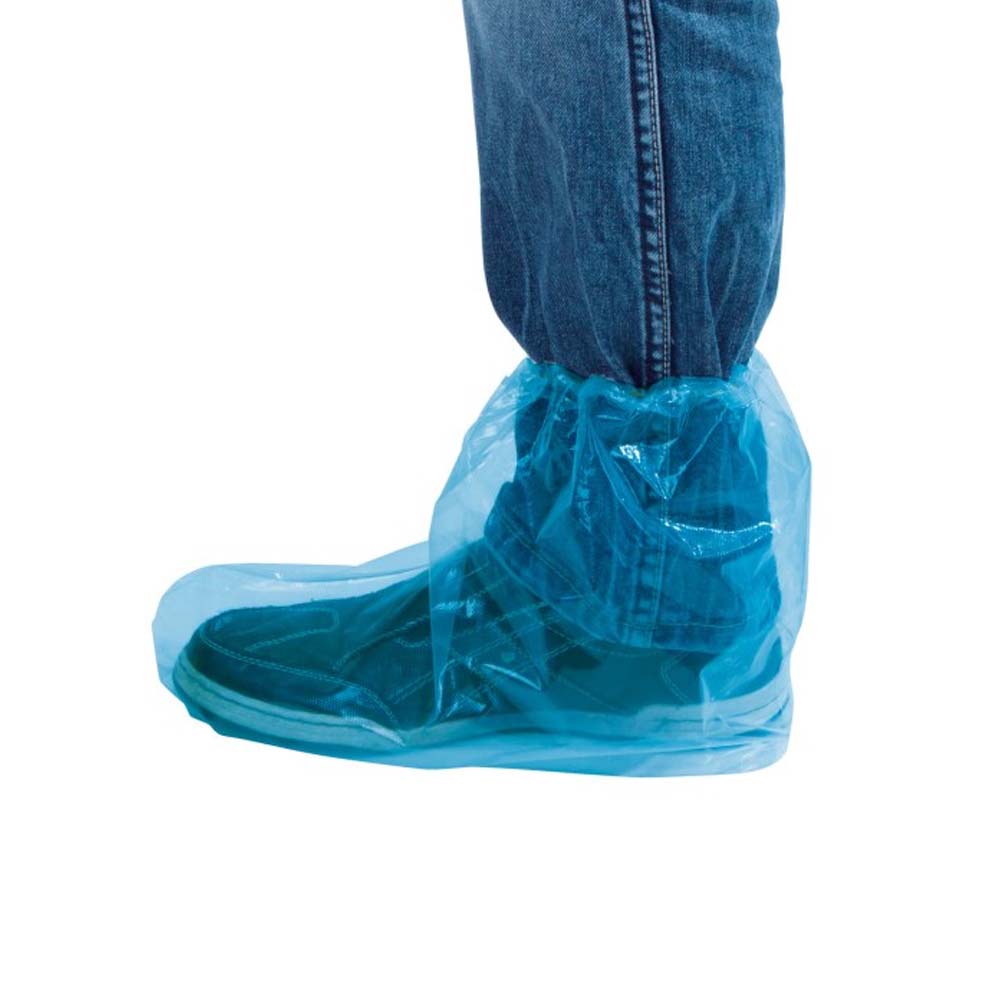 Einweg-Überschuhe aus Polyethylen lassen sich leicht über saubere, trockene Schuhe ziehen. Öffnung dehnen, anziehen, fixieren – nach Gebrauch von der Ferse abziehen und ordnungsgemäß entsorgen.