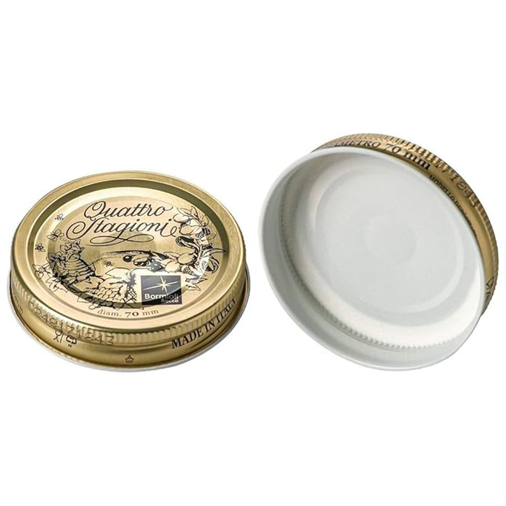 Die Ersatzdeckel für 4 Stagioni Bormioli Gläser bestehen aus robustem Metall und sind ideal für die häusliche Konservierung. Ihr durchdachtes Design sorgt für eine luftdichte Versiegelung, die die Frische der Lebensmittel bewahrt und das Eindringen von Luft und Feuchtigkeit verhindert. Sie sind geeignet für die Konservierung im Wasserbad sowie für die Drucksterilisation, was optimale Lebensmittelsicherheit gewährleistet. Zudem sind sie BPA- und phthalatfrei, was maximale Gesundheitssicherheit garantiert. Das Innere des Deckels ist so gestaltet, dass ein zuverlässiger Verschluss entsteht, der Geschmack und Qualität der Lebensmittel bewahrt.