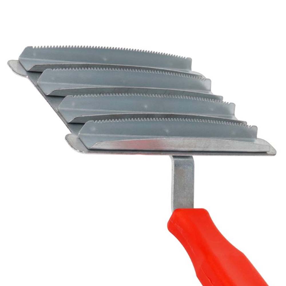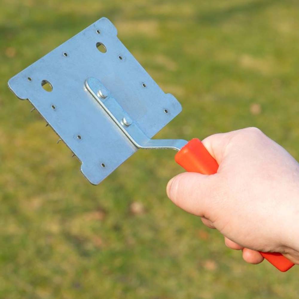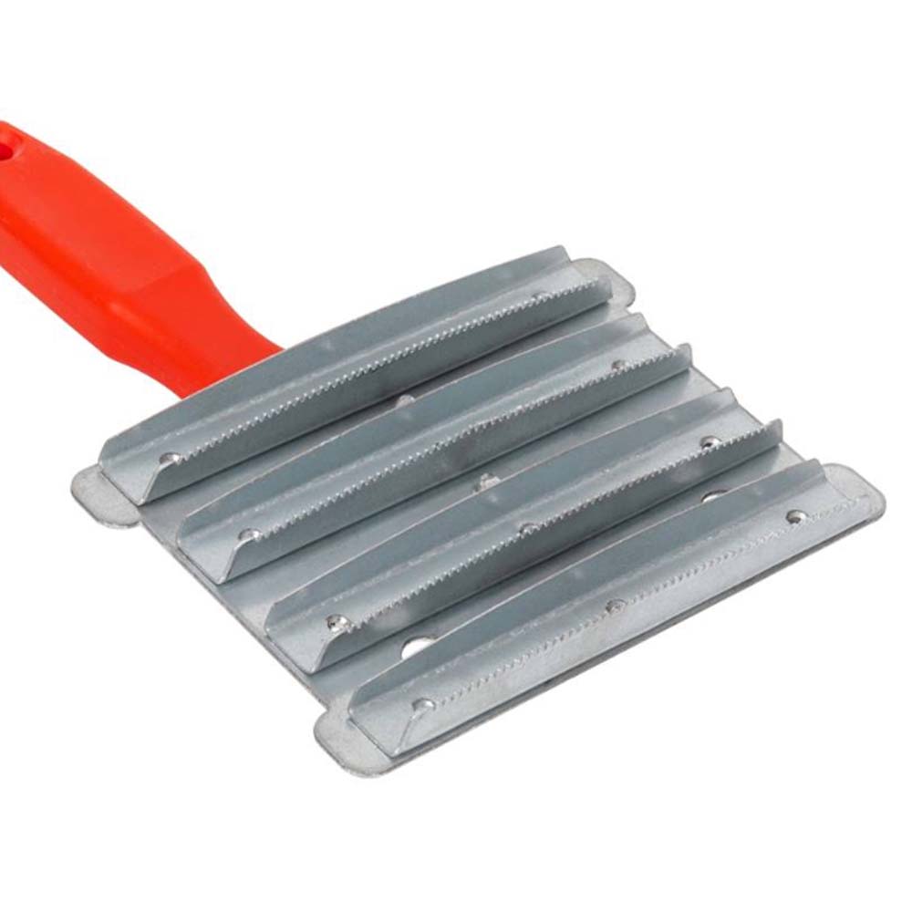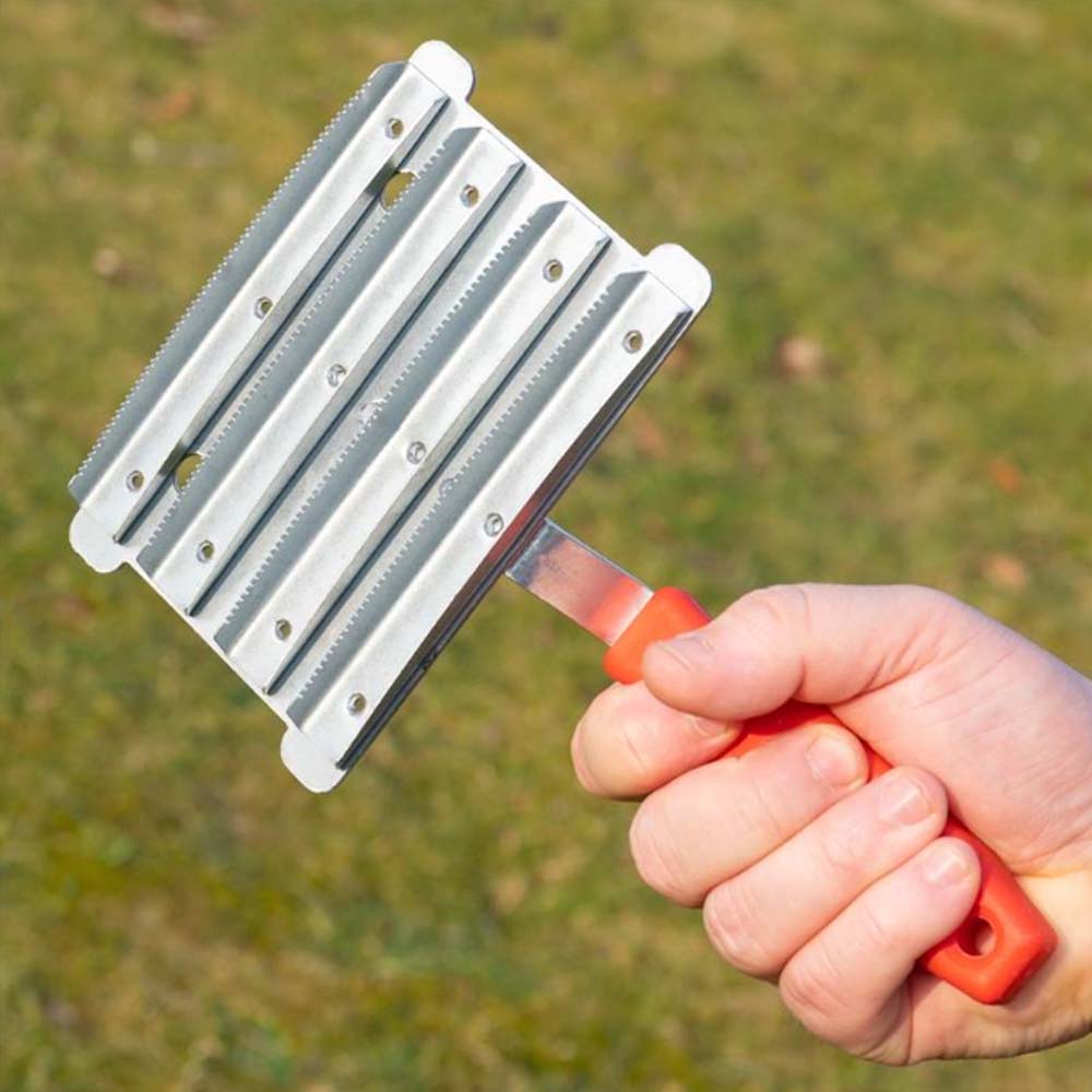 • Verzinkte Reinigungsegge für Kühe und Rinder mit Kunststoffgriff und beabstandeten Zähnen