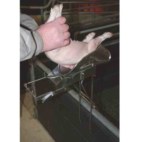- By attaching a clamp in the direction of the piglet's head, the hind legs are fixed and the lower half of the body is elongated