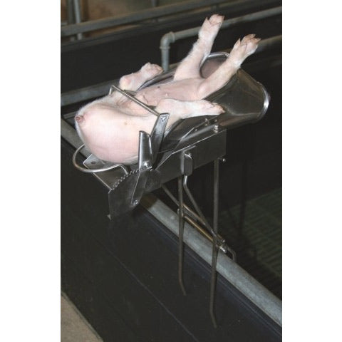 - the piglet is lying on its back with its head forward into the device