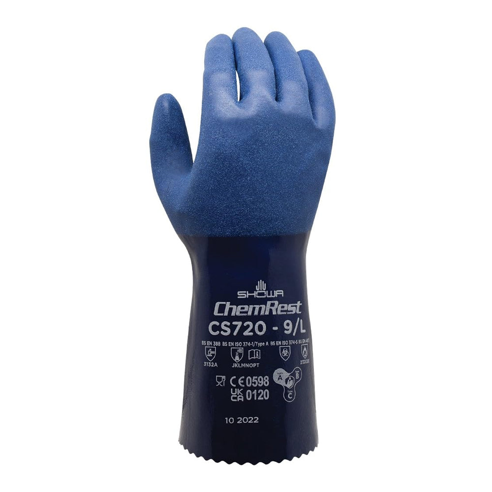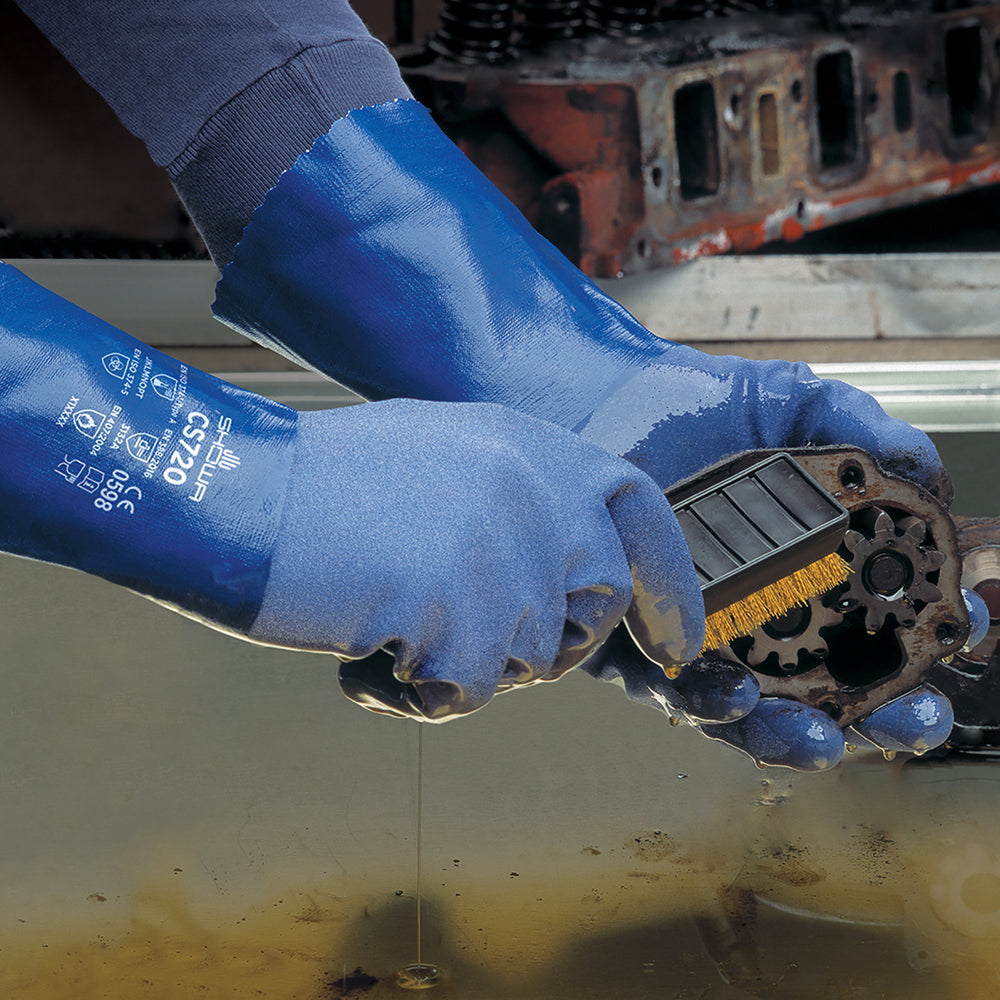 - The double-dipped nitrile coating of the chemical-resistant SHOWA CS720 gloves protects your hands from harmful substances.