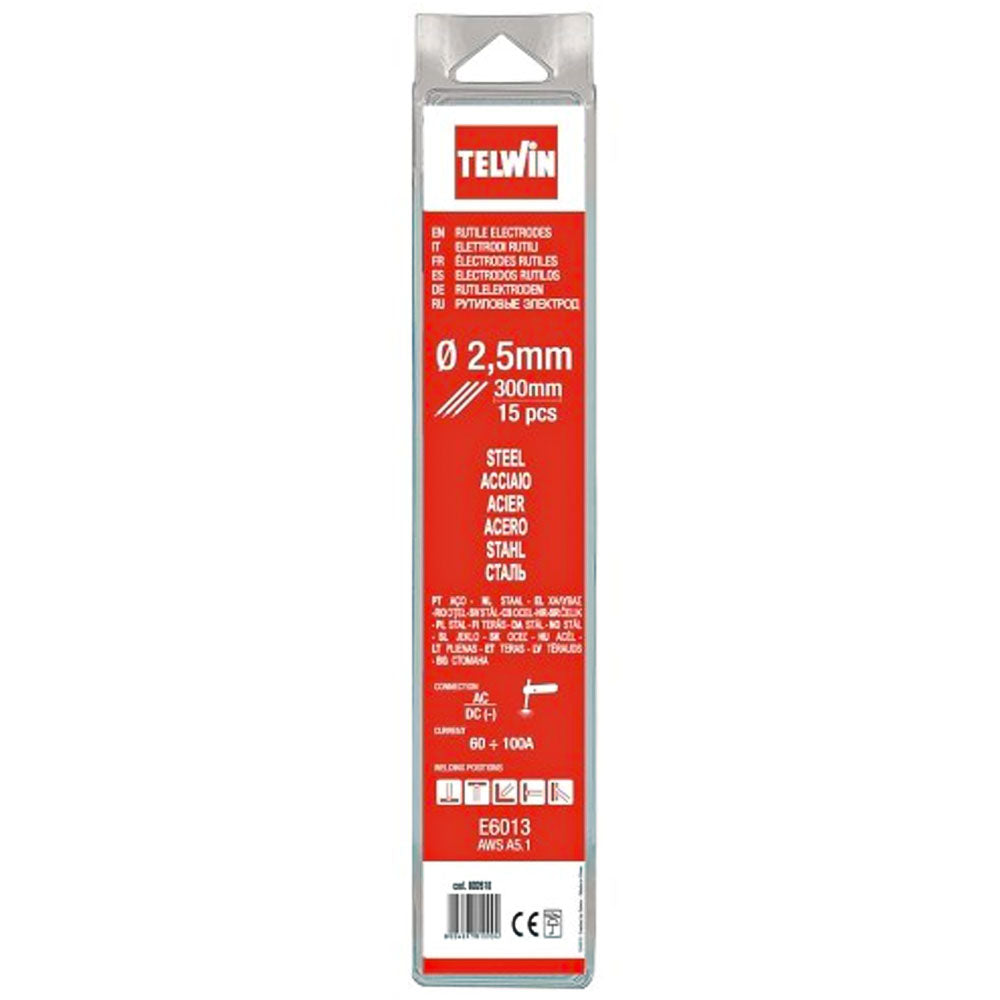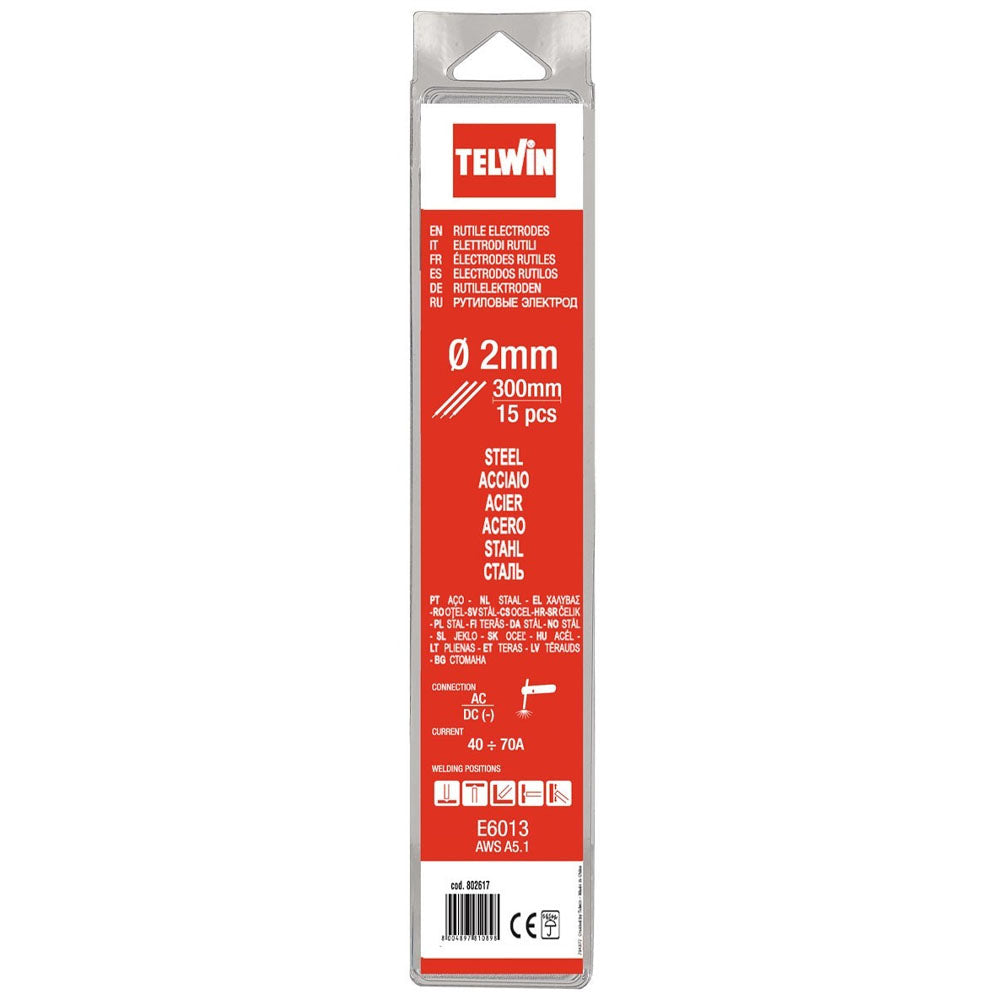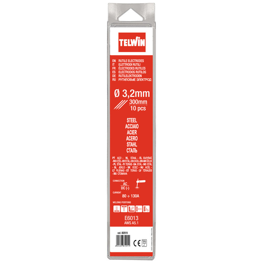 Telwin rutile electrodes for steel welding are engineered for optimal performance with both AC and DC currents. Packaged in handy blister packs, they come in standard diameters (2.0 – 2.5 – 3.2mm) and 300mm length, ideal for versatile welding tasks. The special rutile coating ensures excellent arc stability, easy ignition, and smooth slag removal, delivering clean and visually appealing welds. Suitable for use in all positions, these electrodes offer solid mechanical properties in the weld zone.