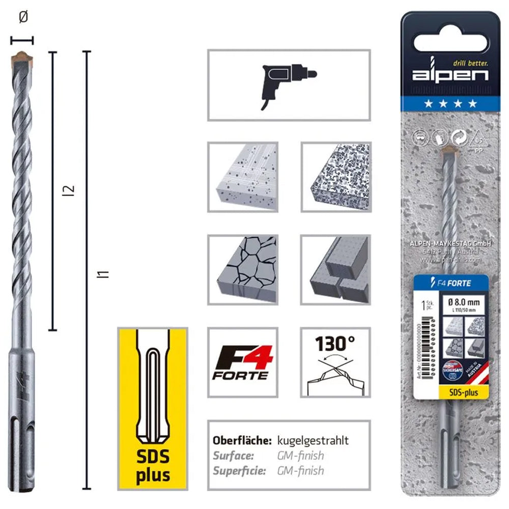 The Alpen F.4 SDS Plus Drill Bit 24x260mm is engineered for professional drills and delivers top performance when drilling in concrete, natural stone, and masonry. Its patented 4-flute step profile combined with a patented carbide plate ensures durability, precision, and fast drilling progress.