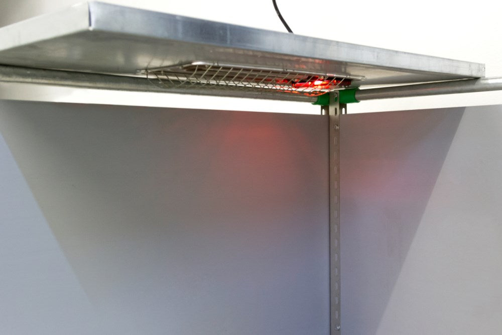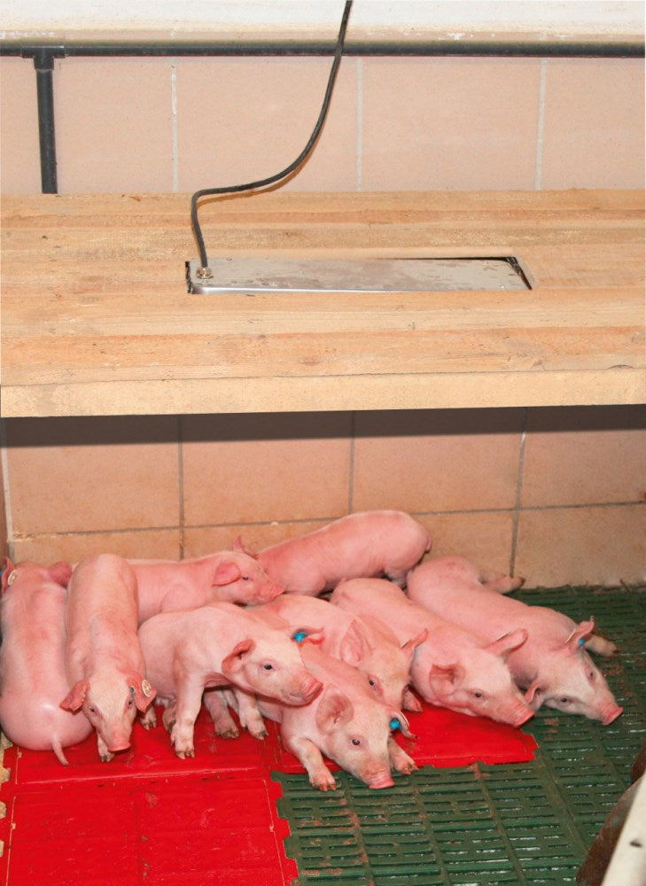 Key benefits include reduced stress for the young animals and improved efficiency due to a shorter overall usage time and the ability to adjust the device's power. The SunnyBoy irradiator should be installed in combination with a nest cover (integrated or mounted below) to allow the heat to accumulate and form a "cushion." It is easy to clean with a high-pressure cleaner, thanks to its IPX7 protection rating, which minimizes maintenance. The device’s body is made entirely of stainless steel, ensuring durability and longevity. Additionally, it includes red light for added benefit.
