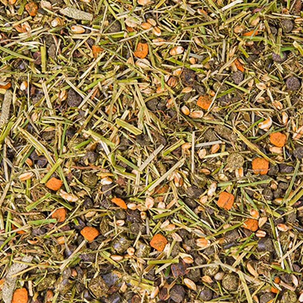 36.5% alfalfa, sunflower husks, barley flakes, timothy grass, sunflower extract, apple pulp, puffed barley, carob, extruded corn, sunflower oil, linseed expeller, calcium carbonate, monocalcium phosphate, sodium chloride, corn germ, magnesium oxide, beetroot, linseed oil, 0.5% herbs (turmeric, basil, rosemary, fennel, mint, nettle).