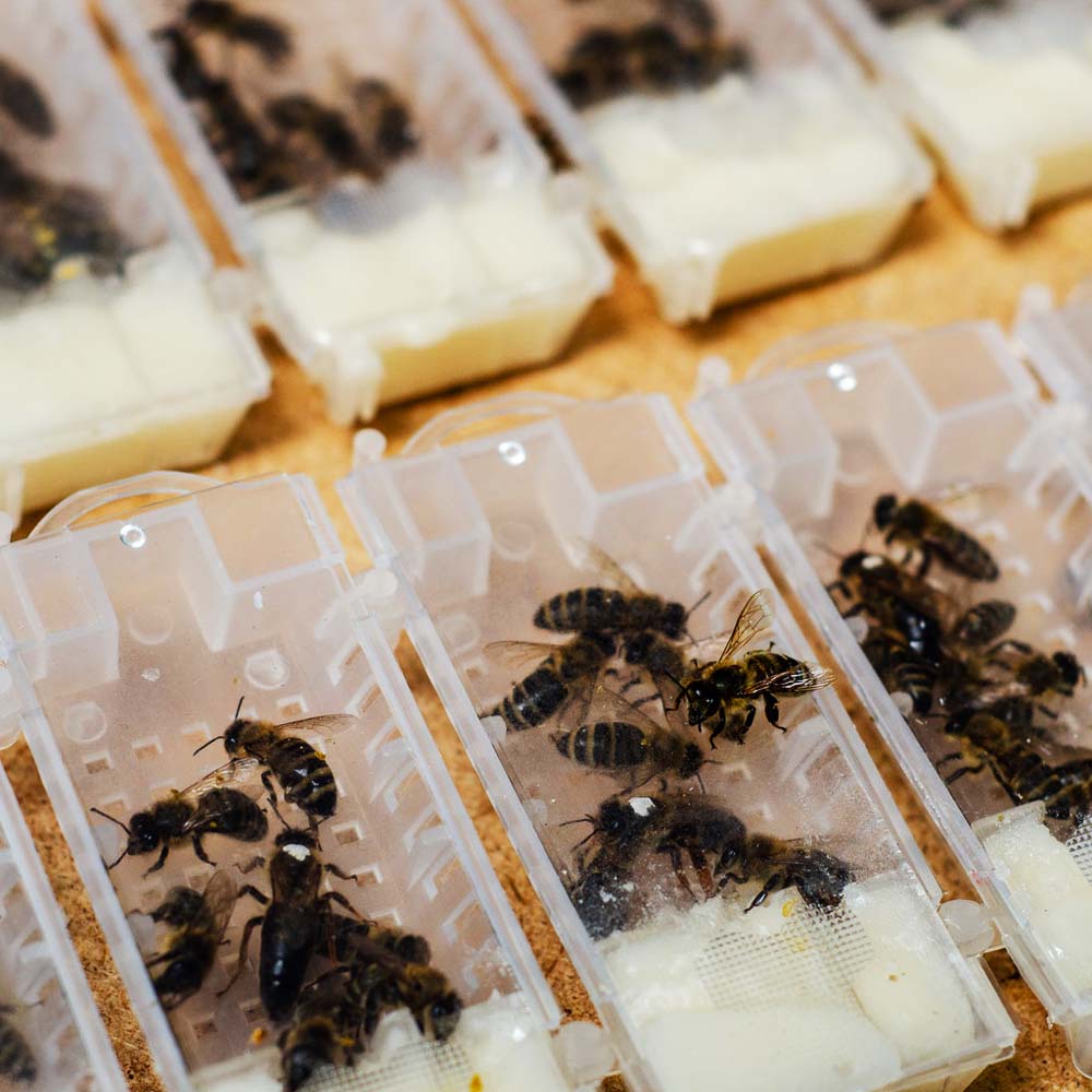 Small plastic cage for shipping or for introducing the queen into the hive.