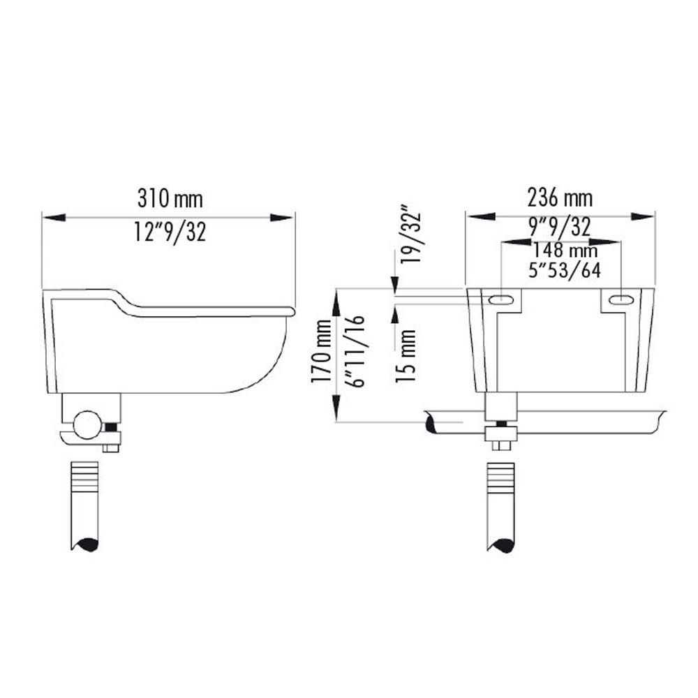 - Specifications: plastic-coated cast iron bowl with drain, capacity 5.5 l, water flow: 8 l / min (at 4 bar), water connection below ¾ horizontal tube; vertical tube (A)