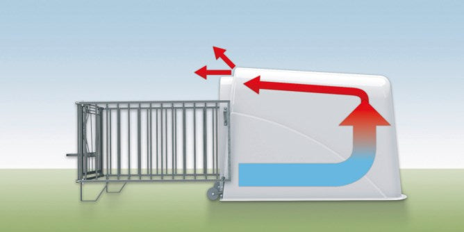 Inoltre, il sistema di ventilazione ottimizzato permette una regolazione efficace del clima interno, senza la presenza di correnti d'aria che potrebbero disturbare l'animale. Questa caratteristica rende la capanna ideale per mantenere un ambiente salubre e confortevole per il vitello.