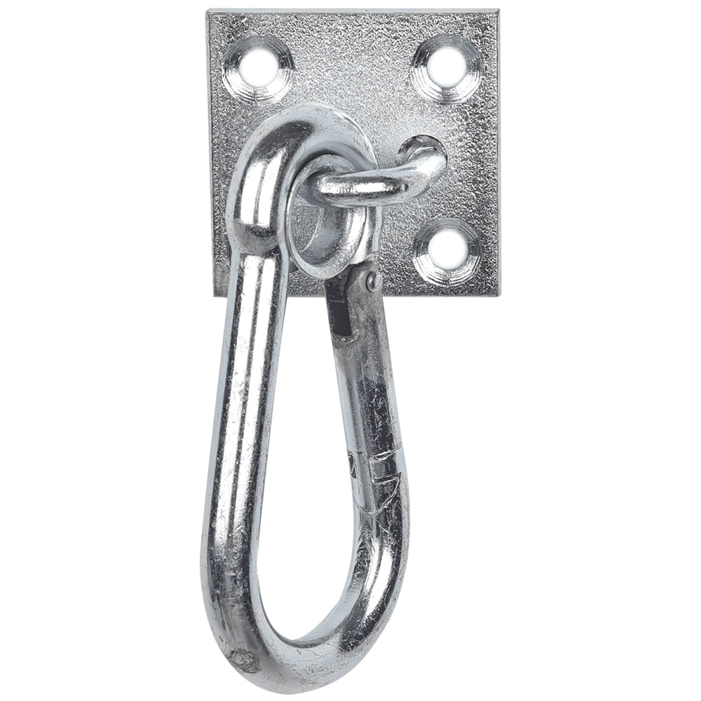 Robusto moschettone montato su una piastra in metallo con quattro fori preforati per un fissaggio facile e sicuro a pareti o superfici in legno. Ideale per appendere attrezzi, corde, utensili da giardino o per fissare carichi in garage, officine o ambienti esterni. Viti non incluse.